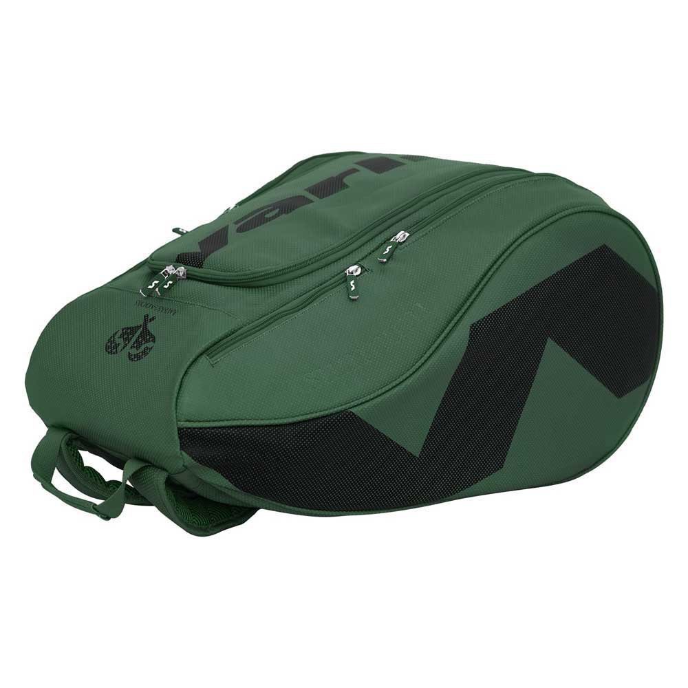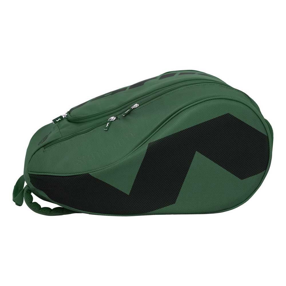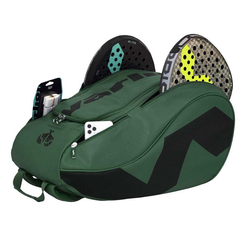 Compartimientos: encontrarás un bolsillo principal de gran tamaño donde puedes guardar tu ropa, toalla, accesorios, etc., otro para guardar tu laptop gracias a su bolsillo especial con separación y sujeción y otro para tu pala. También encontrarás dos pequeños bolsillos laterales en donde puedes guardar tu móvil, llave, cartera y demás objetos personales, y otro para el calzado en la parte inferior. Este último cuenta con tres orificios pensados para que el calzado tenga una buena ventilación y además permita caer la suciedad acumulada en la suela cuando terminas de jugar.